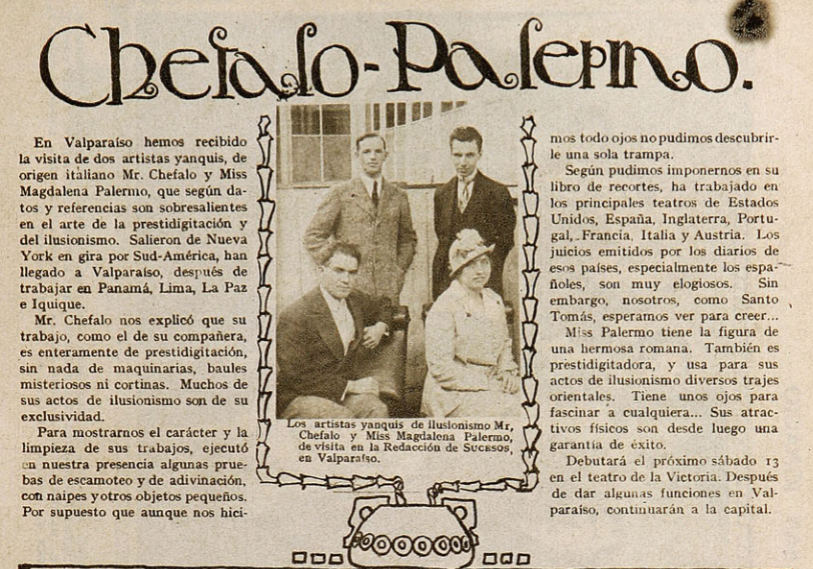 En pleno 1917, mientras gran parte del globo continúa recrudeciéndose a causa de la Gran Guerra, comienza una travesía de dos artistas que no sólo escapan de esta invasiva contingencia, sino que también, invita a su público a “escapar de su realidad” mediante un arsenal de trucos e ilusiones. Se trata de Mr. Chéfalo y Miss Magdalena Palermo, dos “artistas yanquis” (como les denominó la prensa de aquel entonces) que iniciaban una gira sudamericana desde Nueva York. Europa ya fue conquistada en ocasiones anteriores por este sorprendente dúo, por lo que había llegado el turno de gran parte del cono sur. Pasando por Panamá, Lima y La Paz, arriban a Chile para ofrecer su espectáculo en diferentes ciudades. Ya sea en Iquique, Valparaíso, Santiago o Sewell, su show veraniego ya acumulaba expectación por sus curiosas vestimentas que transportaban a lugares epopéyicos y orientales, o también, por su habilidad en la prestidigitación.