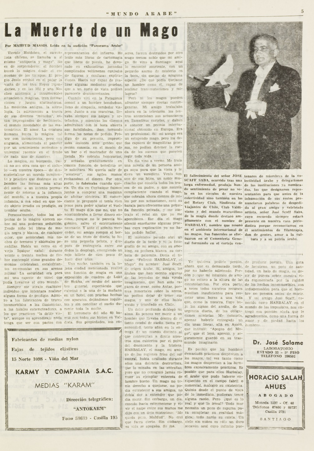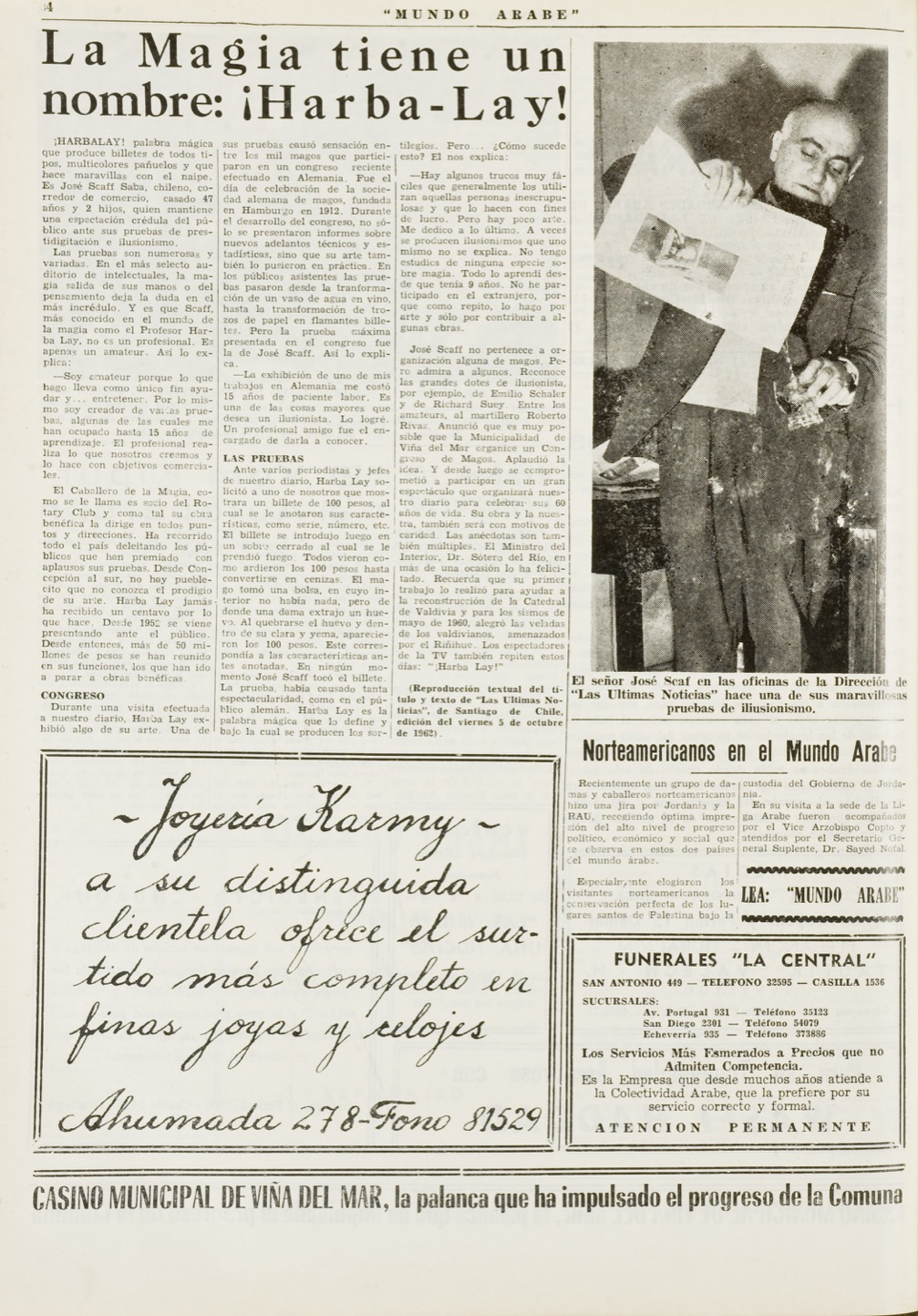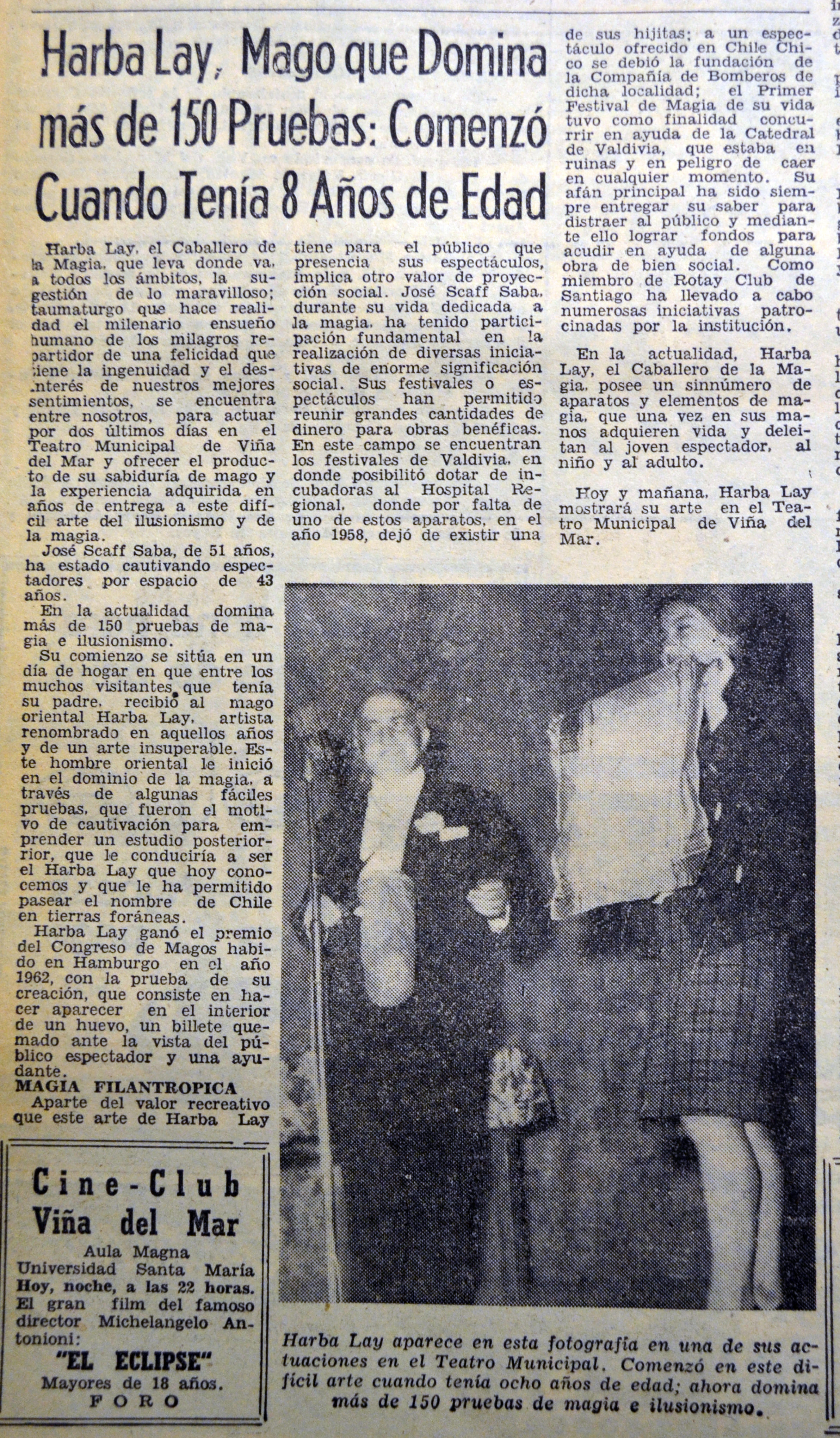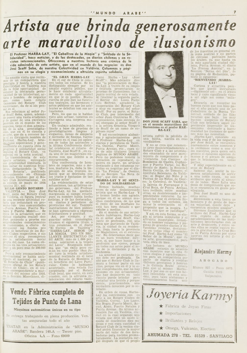 Para el periódico “Mundo árabe” (semanario por excelencia de la colectividad árabe en Chile, ex – La Reforma) era común dedicar secciones en las que profundizaban en destacados personajes que tenían este origen y arraigo. Para agosto de 1959, una de sus páginas presentaba al “Sembrador de ilusiones”, quien fuera un curioso mago e ilusionista de nombre José Scaff Saba, quien nació en Santiago el 28 de junio de 1913, y cuyo nombre artístico fue Harba Lay, el cual presenta un significado similar a ‘guerra a él’. José Scaff, Se casó con Graciela Vásquez Martínez en 1942, con quien tuvo dos hijos, José Alberto y Patricio Claudio. Sin duda alguna, José Scaff, se convirtió en uno de los artistas que tuvo un agradable impacto en sus audiencias desde donde provenía, como lo fue Valdivia. Sin embargo, su trayectoria le hizo ampliar sus escenarios, siempre con dos grandes consignas que le diferenciaron del resto.