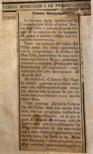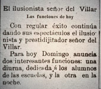 Se menciona sobre tres funciones realizadas por del Villar, resaltando el número de sonambulismo con una niña.