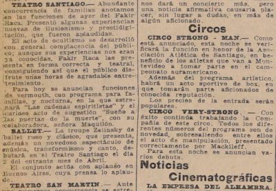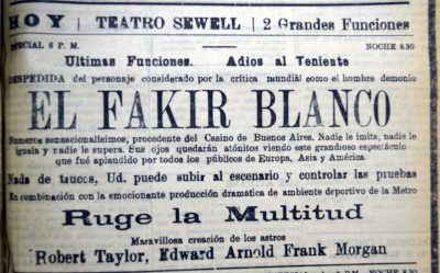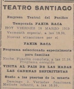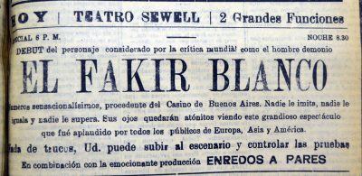 Se anuncia la llegada al Teatro Santiago el Fakir Racca, destacandose por su acto de hipnotismo, destacando la prueba cataléptica del "Muerto Vivo"