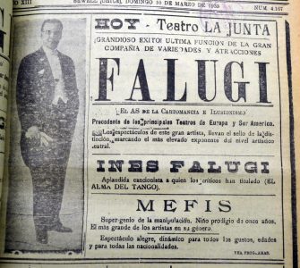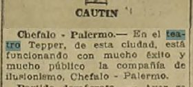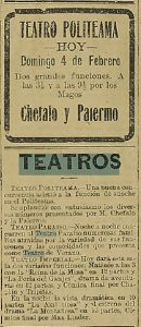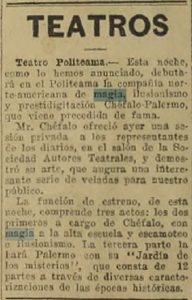 Se menciona que este dia Chefalo Palermo realizara una presentación en el Teatro Politeama. Antes de aquello realizó una sesión a los periodistas en el salón de la Sociedad de Autores Teatrales. El acto se presenta en tres partes, las primeras dos a cargo de Chefalo y la tercera parte de Palermo con el "Jardín de los Misterios"