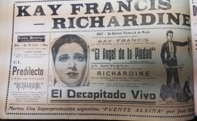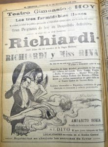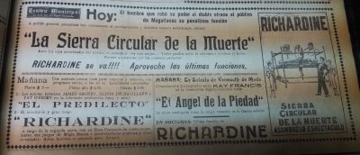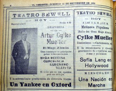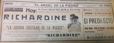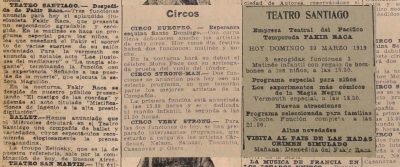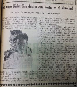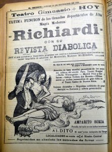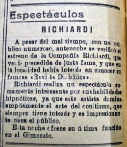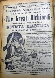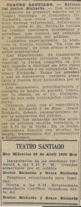 El doctor Richard se presenta en el Teatro Santiago, el programa consta de tres partes. La primera consiste en escamoteos y prestidigitación, terminando con una gran ilusión denominada "La reina del dado". La segunda parte, transmisión del pensamiento y telepatía, acompañado de Mme. Grace Richards. La tercera parte, número "La liga de las naciones" y exhibición de películas cómicas"