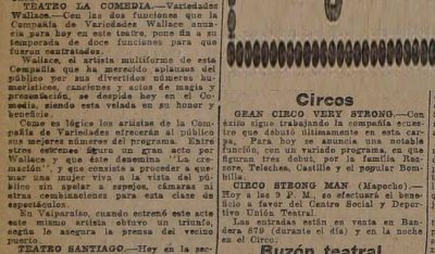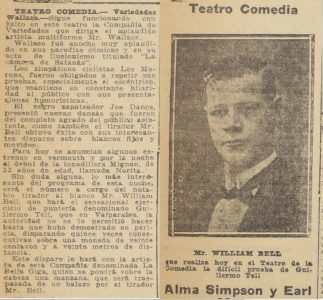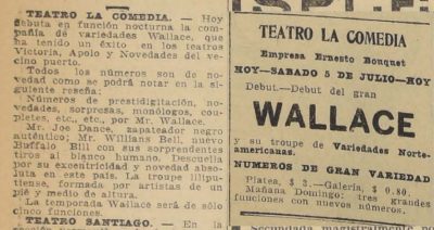 Artista multiforme Mr. Wallace, que se presentaba en Valparaíso y que se extrae una nota del diario local. La primera parte del acto estaba compuesto por actos de humor y magia de Wallace, lo acompañan ciclistas Les Morons, un zapateador Joe Dance, el tirador Mister Bell, quien lo acompañaba La Bella Vega. Deja una nota de prohibición de este tipo de espectáculo "La autoridad debía prohibir este espectáculo, denominado "Guillermo Tell"