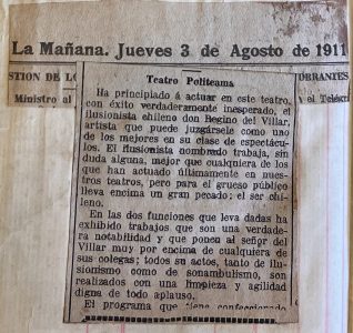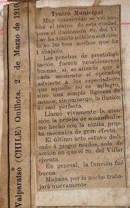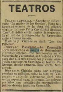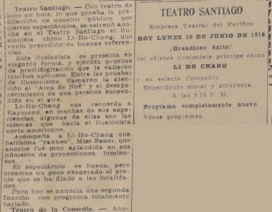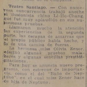 Se presenta Li Ho Chang en el Teatro Santiago, se alude que el repertorio que se presenta se le recuerda a Raymond, se destaca que: "Tuvo sin embargo, el espectáculo esos momentos infantiles de que siempre adolecen las funciones de los ilusionistas y en los que languidece el intereses de los espectadores". Acompañada de Miss Olivia Zenor.