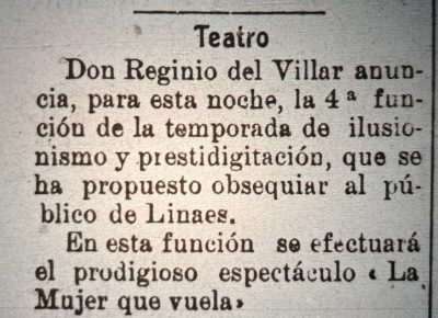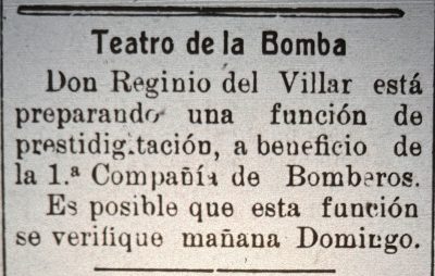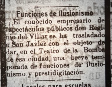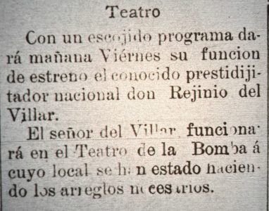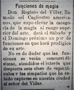 Se menciona al rei mago- Reginio del Villar y su espectáculo con cartomancia, fantasmagoria, etc.