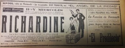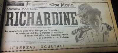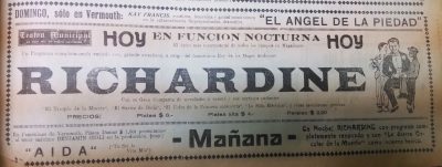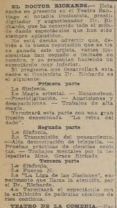 El doctor Richard se presentará en el Teatro Santiago, el programa consta de tres partes. La primera consiste en escamoteos y prestidigitación, terminando con una gran ilusión denominada "La reina del dado". La segunda parte, transmisión del pensamiento y telepatía, acompañado de Mme. Grace Richards. La tercera parte, número "La liga de las naciones" y exhibición de películas cómicas"