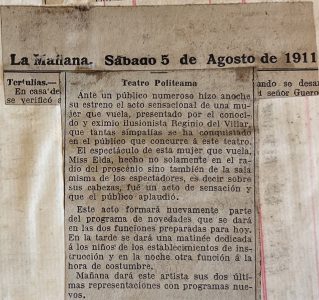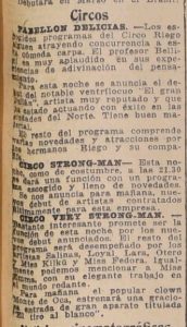 Se menciona algunos números de Reginio del Villar o el rei mago. Se destaca la participación de aidita, una niña de 9 años. Miss Elda realiza el número de la mujer que vuela.