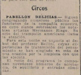 El circo Riego destaca por el acto del profesor Bellini, con números como la transmisión del pensamiento.