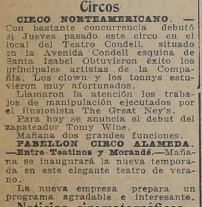 El circo esta situado en el local del Teatro Condell, ubicado entre Condell con Santa Isabel, parte del elenco esta compuesto por el zapateador Tomy Wine y el ilusionista The Great Ney's.