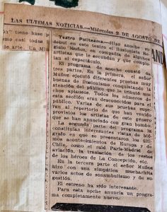 Se presenta Li Ho Chang en el Teatro Santiago, se alude que el repertorio que se presenta se le recuerda a Raymond, acompañada de la norteamericana Miss Olivia Zenor.